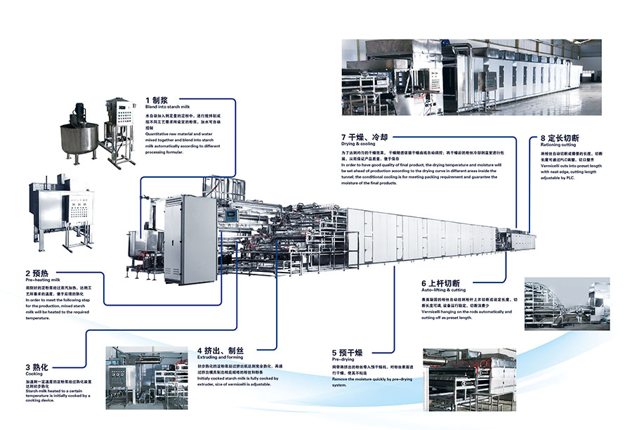 非冷凍粉絲粉條生產(chǎn)線(xiàn)是我司最新研發(fā)環(huán)保節能型設備,實(shí)現了從前序調漿至產(chǎn)品產(chǎn)出工業(yè)化連續生產(chǎn),中間無(wú)人工操作。設備占地面積少,性能穩定,產(chǎn)品工藝成熟;凡與食品接觸部分及設備的內外包裝均采用SUS304不銹鋼或無(wú)毒食品級材料制作,符合國際食品衛生標準。