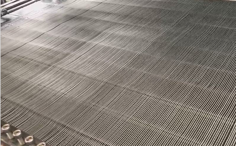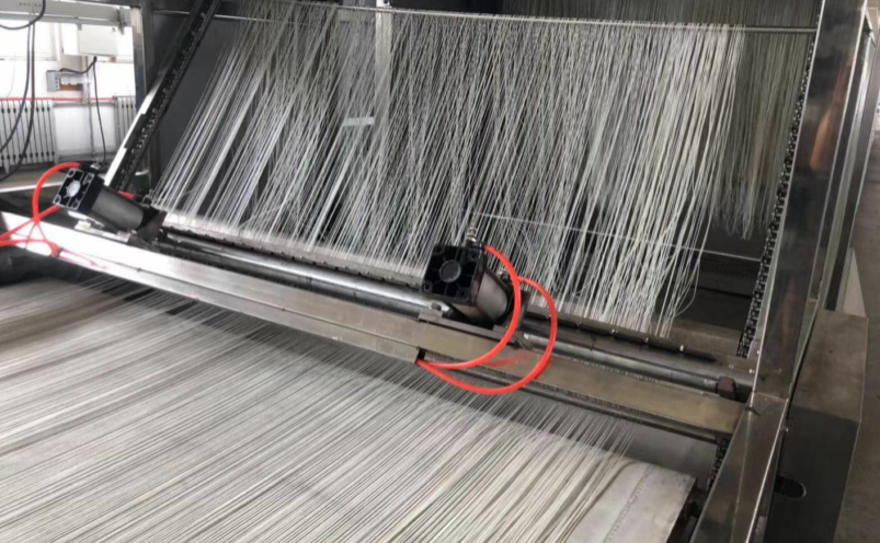 網(wǎng)帶將擠出的粉絲帶入預干燥機,對粉絲表面進(jìn)行干燥,使其不粘連;
